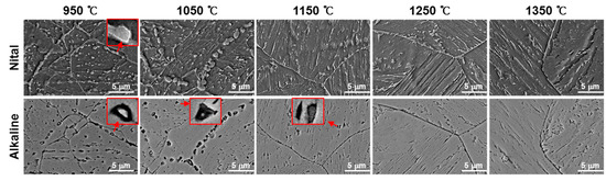 Figure 6 shows the SEM photograph of nital etching and alkaline sodium picrate etching at various peak temperatures (950–1350 °C). The observed position was the same as in Figure 5, and the black band that appeared in alkaline sodium picrate etching was mainly examined. The SEM photographs (marked with an arrow) of nital etching at the peak temperature of 950 °C exhibited white spherical precipitates. Precipitates were not observed in the prior austenite grain boundary, and the precipitates were present in a lined form in the transgranular. The precipitate size increased at the peak temperature of 1050 °C, but precipitates gradually dimmed at the peak temperature of 1150 °C and disappeared above the peak temperature of 1250 °C. The SEM photographs (marked with an arrow) of alkaline sodium picrate etching at the peak temperature of 950 °C exhibited white spherical precipitates and holes around the precipitates. At the peak temperature of 1050 °C, the hole size became larger and the precipitate size at the center of the hole became smaller. At the peak temperature of 1150 °C, the precipitate disappeared and only a hole was observed. Further, at the peak temperature of 1250 °C, a black band region did not appear in the SEM photograph as in the case of nital etching. In alkaline sodium picrate etching at 1350 °C, a black band was apparent in the optical microstructure, shown in Figure 5, but black bands are not easily observed in the SEM microstructure in Figure 6. These results indicate that the precipitate was dissolved and the black band appeared in the region where the precipitate was present. The black band was observed only in alkaline sodium picrate etching, but not in nital and Murakami etching.