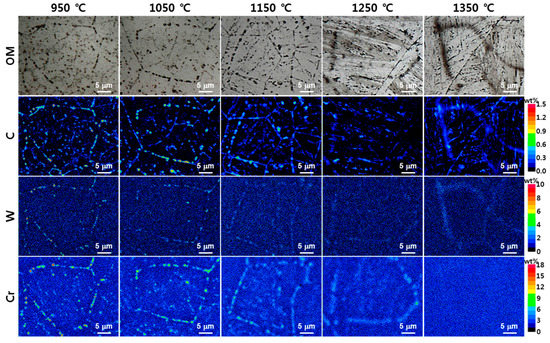 Figure 7 shows the result of EPMA composition mapping to observe the changes of the phase composition at various peak temperatures. The black dot (band) was the region where C, W, and Cr elements were concentrated. As the peak temperature increased, the C, W, and Cr elements gradually diffused. It can be observed that the alloy composition was similar to M23C6, which is the intergranular precipitate of the base material (Figure 3). This is because the M23C6 precipitates composed of C, W, and Cr elements dissolved in the matrix as the peak temperature increased, but the C, W, and Cr elements did not dissolve completely in the matrix owing to insufficient dissolution time of the welding heat cycle conditions. W and Cr are considered to be partially dissolved.