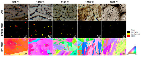 In the EBSD phase map at the peak temperature of 950 °C, a black dot region existed as M23C6 and gamma or as iron. M23C6 and gamma existed alone or together. In the EBSD phase map, iron (gamma) is an austenite, and iron (alpha) of the matrix could be ferrite (BCC), bainite (BCC), or martensite (BCT), but it is considered to be bainite or martensite based on the CCT diagram of T23 and hardness (270 Hv). Therefore, based on the SEM photographs (the alkaline-sodium-picrate-etched microstructure) at the peak temperature of 950 °C (Figure 6), the precipitate was M23C6, and the hole around the M23C6 or the lone hole was austenite or martensite. Similarly, at the peak temperature of 1050 °C, M23C6 and iron (gamma) were present alone or together in the black dot region, or iron (alpha) existed. However, compared to the peak temperature of 950 °C, the amount of M23C6 decreased and that of iron (gamma) increased. At the peak temperature of 1150 °C, the amount of M23C6 and austenite decreased in the black dot region. At the peak temperatures of 1250 and 1350 °C, the black band region was almost iron (alpha) without M23C6 and gamma. The black dots had different directions in the inverse pole figure. It can be observed that a microstructure of lath shape appeared beyond the peak temperature of 1150 °C.