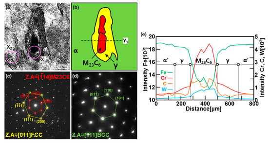 Figure 9 shows the result of TEM analysis of a thin film at the peak temperatures of 1050 °C in order to analyze the microstructure of the phase identification of austenite and M23C6 in EBSD. Rectangular precipitates can be observed in the BF image of Figure 9a, and an elliptical phase can be observed around the rectangular precipitate. This is similar to the shape of the precipitate and the hole around the precipitate in the SEM photograph (alkaline-sodium-picrate-etched microstructure) at the peak temperature of 950 °C of Figure 6. In order to analyze the phase of the rectangular precipitate and elliptical phase, the diffraction pattern of the X1 region was analyzed. In the diffraction pattern analysis, the precipitate was M23C6 and the phase around the precipitate was austenite. The diffraction pattern analysis of the X2 region in the matrix exhibited the BCC structure. As the lath shape was not observed, the matrix was regarded as plate-like bainite. In the EDS line analysis of the Y1 region in Figure 9d, Cr, C, and W were concentrated in M23C6 as shown in the EPMA analysis, and these elements gradually decreased from M23C6 to austenite and the matrix. It is believed that the M23C6 alloying elements such as C, W, and Cr were diffused as M23C6 dissolved in the matrix.