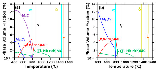 Figure 10. Phase diagram of the SA213-T23 (2.25Cr-1.6W) material calculated using Thermo-calc TCF.6: (a) with the precipitation of M6C carbide and (b) without the precipitation of M6C carbide.
