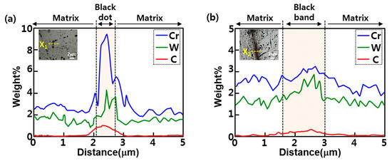 Figure 12 shows the result of EPMA line analysis by enlarging the black dot or band regions at the peak temperatures of 1050 and 1350 °C. In the preceding analysis, the alloying elements of the black dot at 1050 °C identified as austenite were as follows: C: 0.6–1.0%; W: 3–4%; Cr: 7–12%. Further, the alloying elements of the black band at 1350 °C identified as BCC were as follows: C: 0.2–0.3%; W: 2–3%; Cr: 2–3%. It can be observed that the black dot region at the peak temperature of 1050 °C had a higher alloying element of C, W, and Cr than the black band region at the peak temperature of 1350 °C. This is because, as illustrated in Figure 10, the dissolution of M23C6 was further accelerated and the diffusion of the alloying elements was higher at 1050 °C than at 1350 °C.