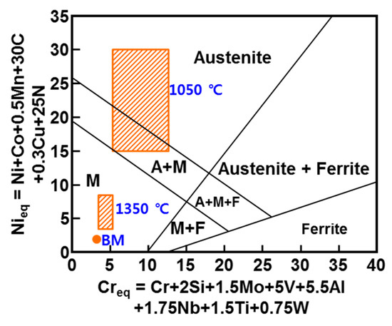 The stabilization region of the phase depending on the alloy composition is shown in Figure 13 in the Schaeffler diagram modified according to H. Schneider [35]. In the Schaeffler diagram modified according to H. Schneider, the alloy component (C: 0.6–1.0%; W: 3–4%; Cr: 7–12%) of the black dot at the peak temperature of 1050 °C was either the austenite or the austenite + martensite region. Moreover, the alloy component (C: 0.12–0.29%; Cr: 2.3–3.2%; W: 1.8–2.9%) of the black band at the peak temperature of 1350 °C was the martensite region.