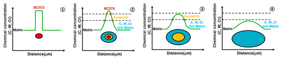 The reason for the decrease of M23C6 and the formation of austenite and its subsequent decrease with the increase in the peak temperature is shown in Figure 14 with a schematic diagram. The alloying elements of M23C6 were C, W, and Cr, and the dissolution of M23C6 increased as the peak temperature increased. In the equilibrium diagram, M23C6 should be completely dissolved at over 800 °C, but it was almost dissolved in the peak temperature range of 1250–1350 °C by the thermal cycle of rapid heating and quenching. Subsequently, the C, W, and Cr alloying elements of M23C6 did not completely diffuse to the matrix and created concentrated regions. As the peak temperature increased, the diffusion of C, W, and Cr increased and the concentration of C, W, and Cr decreased. Therefore, when the concentrations of C, W, and Cr were high, austenite was stable. However, as the peak temperature increased, the alloying component region where the austenite was stable moved to the alloy component region where the martensite was stable.
