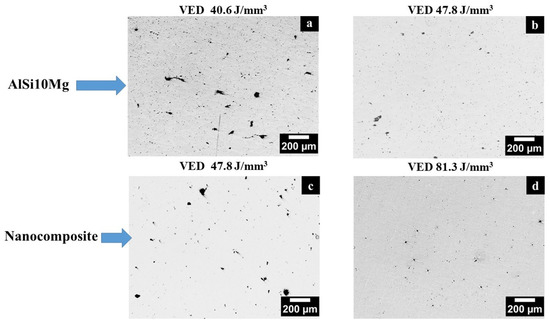 Figure 2 show the OM images of AlSi10Mg and nanocomposite samples built using low VED values and the selected parameters resulting in high densification levels. In the first case, the micrographs reveal the presence of elongated pores, as visible in Figure 2a,c, probably related to lack of fusion. In fact, in literature, similar pores were mainly attributed to an improper selection of the process parameters [5].