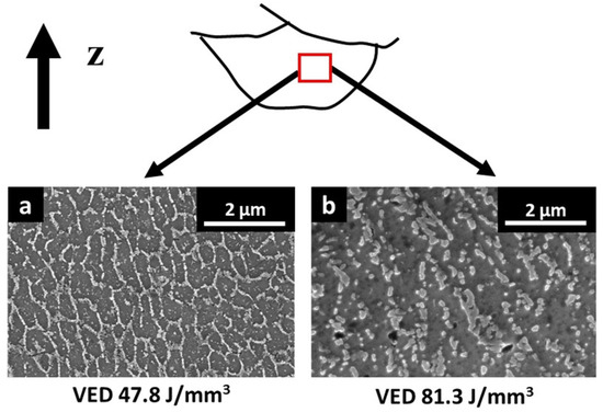 - The different cellular dimensions appear to be chiefly influenced by the VED values; the higher is the VED values, the coarser is the cellular size. In fact, AlSi10Mg samples built with a higher VED value (81.3 J/mm3) exhibited lower tensile properties than AlSi10Mg built with a VED of 47.8 J/mm3.
