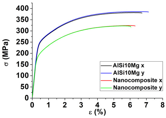Figure 4 illustrates the stress-strain curves of AlSi10Mg and nanocomposite samples, while the tensile data are given in Table 4. First of all, it is possible to note that the EOS stripe scanning strategy guarantees the isotropy of mechanical properties in the x-y plane: for each material, in fact, very slight differences are recorded for samples built along the two different directions. On the other hand, it is easily visible that the two materials exhibit significantly different behaviours. In particular, the AlSi10Mg specimens revealed greater tensile properties than nanocomposite ones: the AMC presents a reduction of the yield (σ0.2) and ultimate tensile strength (σUTS) of about 30% and 20%, respectively, with respect to the alloy.