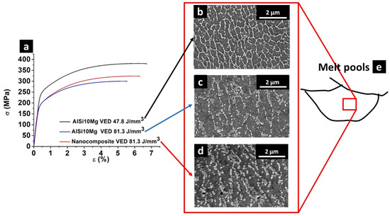 In order to support this hypothesis, tensile tests were performed on AlSi10Mg samples built along the x-direction using the selected VED of the nanocomposite (81.3 J/mm3) and the results are compared with those of AlSi10Mg (built with standard VED of 47.8 J/mm3) and nanocomposites (VED of 81.3 J/mm3) in Figure 5a and Table 5. Furthermore, the microstructures of the specimens were observed (Figure 5b–d) within the central part of the melt pool, as schematically reported in Figure 5e.