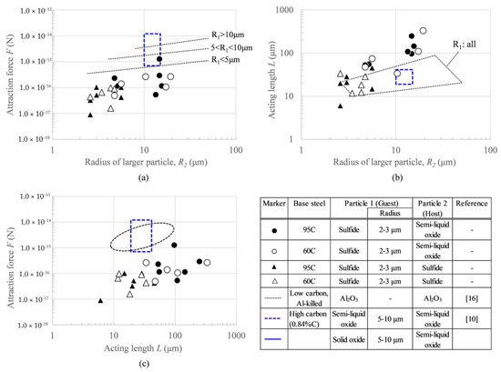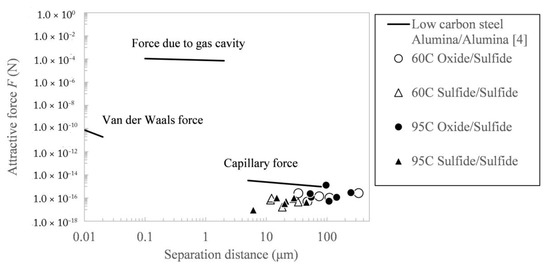 - The attraction force of sulfide/sulfide and sulfide/semi-liquid oxide pairs on the surface of high-carbon steel was revealed to be slightly weaker than that of the alumina particle pair on the surface of low-carbon steel. Possible reasons could be the particle size and wettability, which is affected by the temperature and carbon percentage in liquid steel and the surface roughness of solid particle.