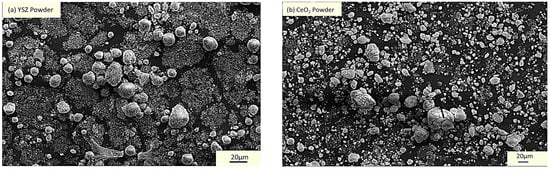 The starting materials used were commercially available 8 mol % yttria stabilized, cubic phase zirconia (8YSZ) powder (particle size 20–50 µm), and high-quality ceria powder (particle size of 20–60 µm), and acquired from Sigma Aldrich India Pvt Ltd., Bangalore, India. The powder morphology is shown in Figure 1. CeO2 and 8YSZ powders were mixed in a ratio of 10:90, 12:88 and 14:86 by weight by ball milling (VB Ceramic Consultants, Chennai, India) for about 15 min at 300 rev·min−1 to ensure uniform mixing. Tungsten carbide balls (60 mm diameter) were used for ball milling. Green cylindrical compacts (8 mm in radius and 5 mm height) were made by pressing the blended powders in a 50 ton hydraulic press with a uniaxial pressure of 5 ton. The pressed compacts were sintered in the microwave furnace operating at 2.45 GHz frequency. The SiC susceptor was used in the MW furnace (VB Ceramic Consultants, Chennai, India). In order to obtain an accurate value of density, hardness, etc., three samples of each composition were sintered in the same run. The MW sintering conditions used were temperature of 1400 °C for 20 min. For comparison, in parallel another set of samples was sintered in the conventional furnace at 1400 °C with dwell time of 5 h with a heating rate of 5 °C per minute. The sintered densities of the ceramics were measured using the Archimedes method. The phase composition of the sintered ceramics was identified using XRD (BRUKER D8 Advanced, Yokohama, Japan, Cu Kα, λ = 1.5405 Å) with an exciting potential of 40 kV, and the current of 30 mA. XRD performed on all of the specimens in 2θ range of 20–90°. Scanning electron microscope (Zeiss Penta FET precision, Model: 51-ADD0048, Carl Zeiss Pvt Ltd, Bangalore, India) with working distance of 11.5 mm and 20 kV voltage was used to examine the microstructure of the sintered samples. Prior to SEM analysis, the surfaces of the specimens were well polished using diamond paste, and were thermally etched by holding in a furnace at 100 °C below the sintering temperature for 1 h. The grain sizes of the samples were calculated by the linear grain intercept method using SEM micrographs. The hardness of the samples was measured by using semi-automatic Vickers’s micro hardness tester (Chennai Metco Private Limited, Chennai, India) at 500 kgf load with the diamond pyramid indenter with a dwell time of 10 s. The reported hardness values are an average of ten indentations made on random spots throughout the surface.