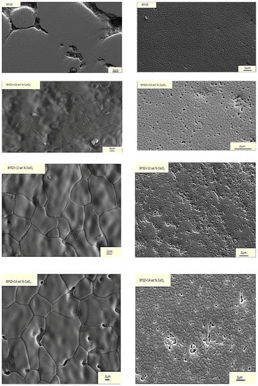 SEM images of CeO2 doped YSZ sintered ceramics. (a) 8 mol % YSZ; (b) 10 wt % CeO2+8YSZ; (c) 12 wt % CeO2+8YSZ; and (d) 14 wt % CeO2+8YSZ. (Left side conventional and Right side Microwave sintered samples).