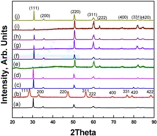 X-ray diffraction (XRD) patterns of the (a) 8YSZ Powder; (b) CeO2 powder; (c) conventional sintering (CS) 8YSZ; (d) Microwave sintering (MW) 8YSZ; (e) CS 8YSZ + 10 wt % CeO2; (f) MW 8YSZ + 10 wt % CeO2; (g) CS 8YSZ + 12 wt % CeO2; (h) MW 8YSZ + 12 wt % CeO2; (i) CS 8YSZ + 15 wt % CeO2; (j) MW 8YSZ + 15 wt % CeO2.