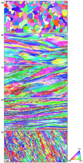 Grain refinement of metals and alloys as a method to increase their strength is being used systematically since several decades. Severe plastic deformation (SPD) techniques—such as equal-channel angular pressing (ECAP) [1], high pressure torsion [2], or accumulative roll bonding [3]—have proven to be capable of refining microstructures down to the submicron regime [1,2,3,4], which is usually beyond the limit of conventional thermomechanical processing. Most SPD processes are derived from metal forming processes such as extrusion, rolling, or swaging. In contrast to their related forming processes, SPD processes are characterized by an invariance of the sample geometry [4], which facilitates the accumulation of severe plastic strains. The severe straining results in a grain fragmentation, i.e., dislocations forming low angle boundaries (LAGBs), which gradually transform into high angle boundaries (HAGBs) upon increasing strain [5]. The defect accumulation that leads to microstructural refinement and a corresponding increase in strength during SPD processing, but also cold working in general, is not proportional to the imposed strain. The rate of defect storage and structural refinement decreases significantly with increasing strain due to dynamic recovery effects, hence, the change in mechanical properties after the first ECAP pass is typically much stronger than for subsequent passes [1,5,6,7,8,9]. With regard to the elaborate processing required for the generation of an ultrafine grained (UFG) microstructure with a majority of HAGBs and submicron grain size, one might raise the question as to whether the precursor states can provide a better compromise in terms of price-performance ratio. In fact, the use of SPD processes in general could be questioned when considering that precursors to UFG microstructures can typically be generated more economically by conventional cold forming processes.