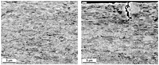 The effect of cyclic loading on the microstructure is investigated qualitatively in cross-sections of fatigue tested samples. Comparisons of the microstructures at the surface of the smallest cross-section (largest stress amplitude) and near the center (neutral fiber) of fatigue tested specimens shows only localized coarsening at the surface of deformed conditions, i.e., cold rolled and ECAP processed samples. This is exemplarily shown in Figure 2 for a sample subjected to one ECAP pass followed by cold rolling. Growth of the grain or subgrain structure is only observable within a few microns from a fatigue crack. In some cases, there is also a zone with a clearer ECCI contrast next to the coarsened region observable, as can be seen in Figure 2b. This indicates a reduced dislocation density, which has also been observed in TEM investigations on fatigue tested UFG metals by other groups [15,16]. Further details on the damage mechanisms of the UFG reference condition are given in [17].