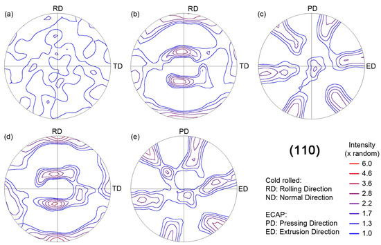 (110) pole figure maps for ARMCO® iron (a) as-received; (b) after cold rolling to 64% rolling reduction; (c) after one ECAP pass; (d) after one ECAP pass followed by cold rolling to 64% rolling reduction; (e) after five ECAP passes along route BC.