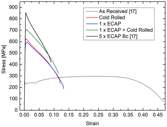 The engineering stress–strain curves of the investigated conditions (Figure 4) exhibit the typical behavior of metals subjected to SPD processes. The yield and tensile strength increase with imposed strain whereas the uniform elongation falls below 1%. Yet, all tested conditions still show a ductile material behavior with a pronounced post necking elongation. The curves for cold rolling with a logarithmic strain of 1.17 (red) and a single ECAP pass with a nominal strain of 1.15 (blue) are very similar, in spite of the difference between nominal and logarithmic equivalent strains. Both processes result in an increase in yield strength by more than 100% as compared to the as-received condition. The combination of one ECAP pass and subsequent cold rolling (green curve) results in a further increase in yield strength by about 100 MPa, i.e., approximately 17%, as compared to just either of these processes. The UFG reference condition subjected to five ECAP passes along route BC exhibits the highest yield strength among all tested conditions with an increase of 45% as compared to the first ECAP pass.