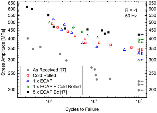 The S–N curves in Figure 5 provide a comparison of the fatigue life for the investigated conditions in the high cycle fatigue regime under four-point rotating bending (stress ratio R = −1). It has to be considered that the testing method results in an overestimation of stress amplitudes if the stress at the surface exceeds the yield strength of the material. This is due to the fact that the stress calculation based on the bending moment assumes a linear elastic behavior. However, this does only affect the as-received condition below 106 cycles, whereas the peak stresses of all the other conditions are well below the macroscopic yield point. The endurance limit of 225 MPa for the as-received state (50 µm grain size) is close to literature values of approx. 210 MPa that were reported for 100 µm grain size [21]. The S–N curves of all the deformed conditions show a substantially higher fatigue strength than the as-received condition, with an increase of at least 50% in stress amplitude for a given number of cycles to failure. The variation of the stress amplitudes in between the deformed states does not exceed 30% and seems to converge towards lower numbers of cycles to failure, i.e., towards higher fatigue loads. With regard to the 107 cycles endurance limits, the lowest values among the deformed conditions are found for the lowest imposed strains, i.e., after a single pass of ECAP (σf~335 MPa) and cold rolling with (σf~350 MPa). The combination of both processes does result in an increase in σf to ~395 MPa, which is already close to the value after five ECAP passes of ~425 MPa (Table 1). Hence, the variation in high cycle fatigue strength between the UFG reference condition and precursors to UFG microstructures is not very pronounced, especially when considering the combination of ECAP and rolling.