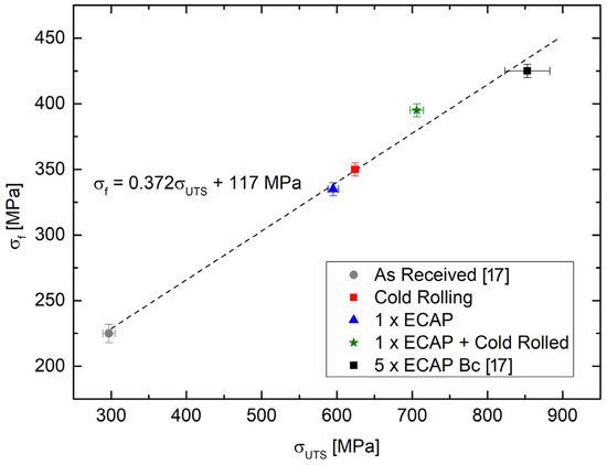The ratios between the endurance limit σf and the ultimate tensile strength σUTS for the tested conditions (Table 1) show that a general ratio of approximately 50%, which is typically reported for steels in literature [22], does hold for the deformed conditions but not for the as-received state. The high ratio of this condition might be related to the effect of interstitial atoms, given that this condition is the only one with an upper and lower yield point followed by a Lüders strain. It is known from literature that the presence of a Lüders strain can affect the endurance limit [21]. Another aspect that could play a role is the change in strain rate sensitivity of the material, which generally decreases with decreasing grain size or increasing work hardening for bcc metals [23]. A higher sensitivity in the as-received condition as compared to the deformed conditions can affect the relation between monotonic and cyclic properties if the strain rates vary substantially. Yet, this contribution is difficult to assess for macroscopically elastic cyclic loading and plasticity being confined to slip bands with unknown local strain rates. However, plotting the endurance limit as a function of the tensile strength (Figure 6) shows that there is a proportionality between both parameters for all investigated conditions but with an offset of 117 MPa. The as-received, cold rolled, and one pass ECAP conditions show a perfectly linear relation, whereas the ECAP plus cold rolled condition lies above the linear regression. This confirms the hypothesis that a combination of ECAP and subsequent rolling can lead to an excellent high cycle fatigue strength, even for precursors to UFG microstructures, which consists of a majority of LAGBs.