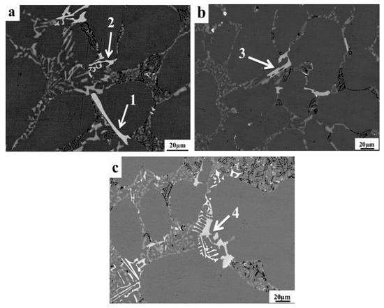 Back-scattered electron micrographs of as-cast alloys: (a) alloy A; (b) alloy B; and (c) alloy C. The arrows indicate (1) acicular Al5FeSi, (2) π-Al8Mg3FeSi6, (3) Al7Si2Fe3, and (4) Al12Si6Fe2(Mg,Sc)5.