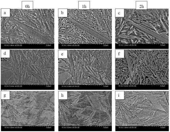 SEM images of different percentage of Cr, in which (a–c) with 0.10–0.18% Cr; (d–f) with 0.60–0.80% Cr; and (g–i) with 1.80–2.50% Cr. All samples were etched at t = 0 h.
