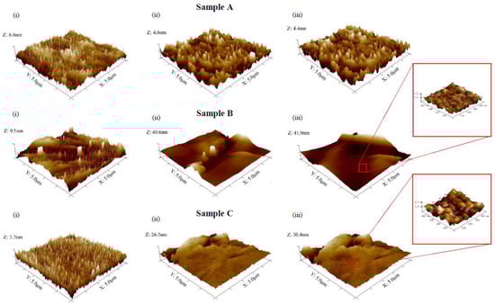 In-situ investigation was carried out up to nano-scale resolution to strengthen the evidence by using Atomic Force Microscope (AFM). The generated three-dimensional mappings from the high carbon steel specimens were continuously recorded to observe surface evolution over a period of time. The entire Figure 2(i) correlates to the first scan (t = 0 min) immediately before it was brought into contact with NaCl solution. Exposed polishing scratches and two-phase microstructure peaks-and-valleys-like are visible, which means surface was affected by the corrosive solution. All Figure 2(ii) demonstrate the epitaxial growth of oxide products that occupied the roughened surface area; scratches were barely visible at this stage. Furthermore, at t = 60 min (5th scan), it can be observed from sample A that the scanned area was laid on martensitic phase, while sample B and C showed flatted-like surface (as martensite), with clear separation (as grain boundary) and valley (as austenite). Additionally, the flatted-like region was believed to be martensitic phase, since the high number on y-axis scale led to the overlapping of small-scaled martensite microstructure. In order to prove this phenomenon, the enlargement area of 3-D images has been presented in Figure 2(iii) on sample B and C, as the existing corroded martensite crystalline structure.