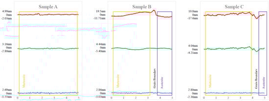 Displays of line scan profiles acquired from AFM results, with separation distance between each line to prevent overlapping—0 min (blue), 60 min (green), and 105 min (red); labelled of microstructure region: martensite (yellow), grain boundary (black), and austenite (purple).