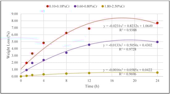 The acquired graph was from the weight loss analysis with highly precise analytical balance, and it was possible to determine the corrosion rate as function of time, presented in Figure 4. These valuable data were compiled and fitted with second-order polynomial expression to obtain the corrosion rate function from its first differentiation. Rapid weight loss was observed from the first two hours of the corrosion process; after this time, the corrosion rate decreased. This was due to the fact that austenitic phase started to corrode and followed by insignificant change of martensitic phase, as there was more Cr content in steel that increased the retained austenite stability; thus, the weight loss lessened.