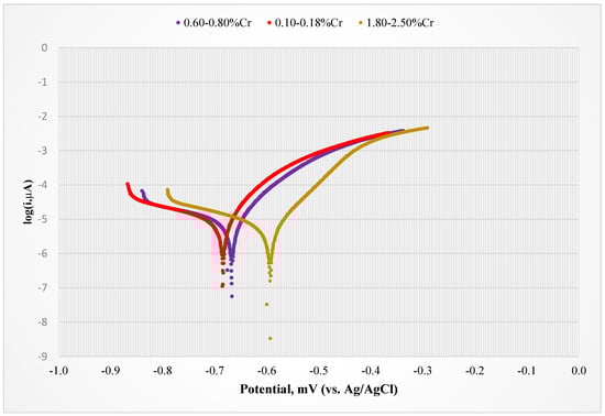 The cathodic and anodic (Tafel) polarisation curves for dual-phase high carbon steels with different Cr content in 0.1 M NaCl solution.