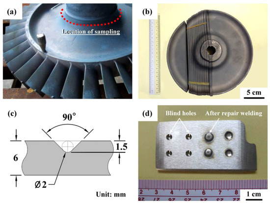 (a) The macro-view of the cast turbine; (b) the tested sample cut from the turbine; (c) the joint geometry of the repair weld; and (d) the macro-view of the repair weld.