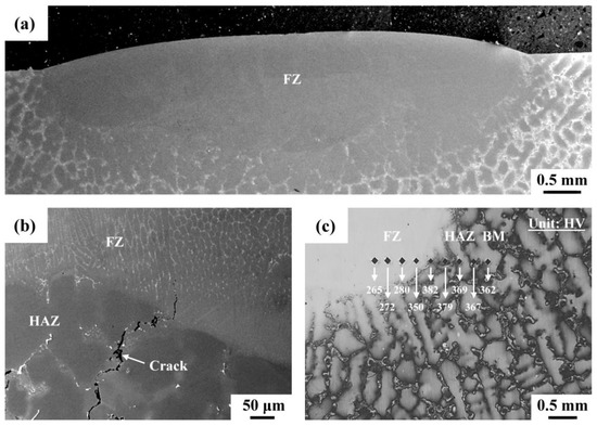 (a) Cross-sectional view of the repair weld; (b) liquation crack in the heat-affected zone (HAZ) of the weldment; (c) microhardness indentations from the fusion zone (FZ) across the weld interface to the base metal (BM).