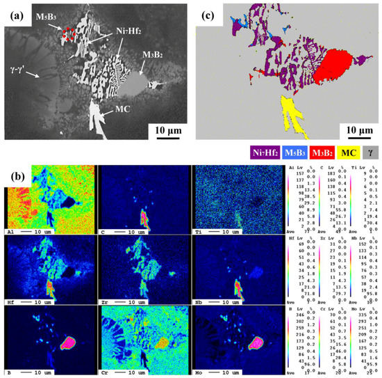 As shown in Figure 3c, lamellar eutectics and solidification products in gray color are present ahead of γ-γ′ eutectic colonies, which are expected to be the terminal solidification products. Further analyses were oriented to understand the constituents of grain boundary products. Figure 5 presents micrographs showing the morphology, distributions of alloy elements, and phase constituents at the solidification boundary. The BSE image (Figure 5a) was useful in distinguishing the possible solidification products according to the image contrast. The EPMA maps (Figure 5b) displayed the distributions of distinct alloy elements. In addition, the EBSD map (Figure 5c) was able to identify the phase constituents of the solidification products. As shown in Figure 5a, several different products, namely irregular white phase, lamellar bright phase, and blocky gray phase, formed near the grain boundary. The Al distribution map indicated that the γ-γ′ eutectic colonies were rich in Al, but co-segregation of Ti was not found as a result of its low concentration. By contrast, co-segregation of Al and Ti was noticed in the γ-γ′ eutectic colonies of IN738 superalloy. The C map could be used to indicate the carbide sites. The results displayed that the C, Nb, and Hf maps showed the same trend of distribution. This meant that the carbides were rich in Nb and Hf. The irregular island-like white phase, indicated by an arrow in Figure 5a, was expected to be MC carbide. The Ti and Zr maps also revealed that Zr and Ti tended to participate in the carbides. Moreover, some fine carbide particles were inter-dispersed along the profile of the lamellar white phase. The EBSD map confirmed that the MC carbides formed in those sites of high C, Nb, and Hf concentrations (Figure 5c). The B map showed the distribution of B, which could be linked to the boride locations. The gray blocky product (Figure 5a), which enriched in B, Cr, and Mo in the corresponding maps in Figure 5b, was proven to be M3B2 boride (Figure 5c). The Zr and Hf maps displayed that the lamellar eutectic (indicated by an arrow in Figure 5a) was rich in Hf and Zr, which naturally showed high brightness in the BSE image in Figure 5a. The lamellar white phase in Figure 5a at the grain boundary region was identified as Ni-Hf-Zr (Ni7Hf2) intermetallics in Figure 5c. Moreover, it was found that M5B3 and M3B2 borides could be inter-dispersed in the Ni7Hf2 intermetallics as shown in Figure 5c.