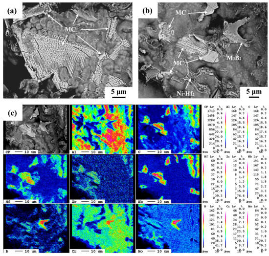 EPMA quantitative chemical analyses were used in order to measure compositions of the complex constituents along interdendritic boundaries. Although the precise chemical compositions of the different phases might not be obtainable due to the interference with the surrounding matrix, the acquired information was helpful in identifying the terminal solidification products. Table 2 lists the chemical compositions (in at. %) of the EPMA results for distinct solidification products as indicated by arrows in Figure 3. The MC carbides (Figure 3a,b, at sites 1 and 2) were rich in Nb with extra Hf and Ti, which naturally revealed high brightness in the BSE image. The lamellar structure (site 3), with high brightness (Figure 3c), consisted of a certain amount of Hf and Zr. The low alloy contents of this measurement resulted from the high yield volume of the electron beam relative to the width of the lamellar structure. However, the co-segregation of Hf and Zr to the lamellar structure could not be neglected. The gray blocky product (site 4), composed of high concentrations of B, Cr, and Mo, could be reasonably concluded to be Cr-Mo borides.
