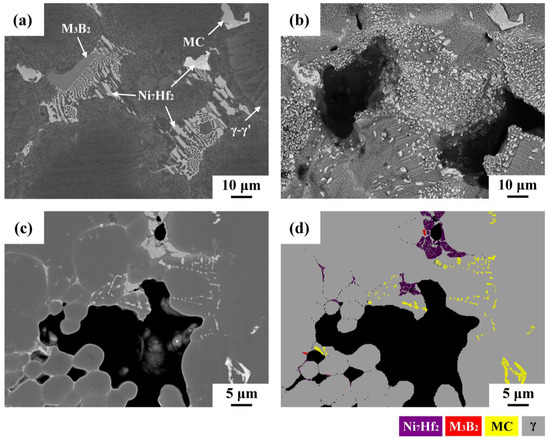 In Figure 4, different microstructures in the cast Mar-M004 were observed by SEM with the BSE mode and identified with the aid of EBSD analyses. The BSE image supported that the irregular bright phases with distinct morphologies (Figure 4a) were MC carbides, as further confirmed by their compositions (listed in Table 3) and EBSD identifications (Figure 4b). The EBSD map revealed that the yellow phases with different morphologies were all MC carbides, which were composed of significantly high Nb and Hf concentrations. It was noticed that few residual white phases could be seen ahead of the γ-γ′ eutectic colonies (Figure 4a,c). Such events indicated that those white phases solidified at a temperature lower than the γ-γ′ eutectic colonies. It has been reported that complex grain boundary constituents, such as MC carbides, M2SC sulphocarbides, Cr-Mo borides, Ni-Zr intermetallic compounds, and γ-γ′ (Ni3(Al,Ti)) eutectics, were obtained in IN738/IN738LC superalloy [13,14,16,25,26]. The EBSD map (Figure 4d) shows that the blocky gray product in Figure 4c was M3B2 boride, which was checked by EPMA measurements as listed in Table 3. The M3B2 boride consisted of very high Cr and Mo concentrations. White eutectic constituents in Figure 4c were proven to be Ni7Hf2 intermetallic compounds by the EBSD analysis shown in Figure 4d. Furthermore, fine M5B3 borides were inter-dispersed in the lamellar Ni7Hf2 compounds. The presence of borides at the interdendritic boundaries inevitably depressed the terminal solidification temperature, thus deteriorating the weldability of the cast superalloy.