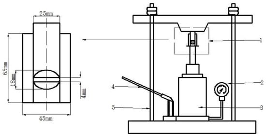 Pressure-forming pellet device (1—Pellet mold; 2—Piezometer; 3—Oil jack; 4—Pressure bar; 5—Pressure support).