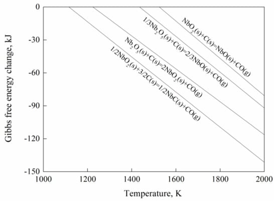 The relationship between the temperature and Gibbs free energy change of the carbothermal reduction reaction of niobium oxides.