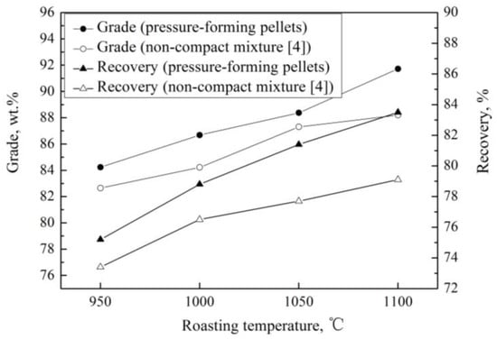 Figure 7 shows the grade and the recovery of Fe in the iron powder magnetically separated from the carbon-containing pellets and in the non-compact mixture after reduction roasting, respectively. Compared to the non-compact mixture, the loading pattern of pressure-forming pellets increases the separation efficiency of Fe, including the grade and the recovery, naturally. The grade and recovery both increase with the increasing temperature. Meanwhile, niobium and rare earth elements were better beneficiated in the magnetic separation tailings. As shown in Figure 8, the grades of Nb2O5 and (REE)O in the magnetic separation tailings from pressure-forming pellets are higher than the ones from the non-compact mixture due to the higher separation efficiency of Fe and the lesser amount of unreacted carbon. In the carbon-containing pellets, the lower carbon addition leads to less unreacted carbon after reduction roasting. After the reduction roasting of the pellets at 1100 °C and the magnetic separation, the iron powder with a grade of 91.7 wt % was obtained, and the grades of Nb2O5 and (REE)O in the magnetic separation tailings were beneficiated to 6.06 wt % and 5.87 wt %, approximately twice the grades in REE–Nb–Fe ore, respectively.