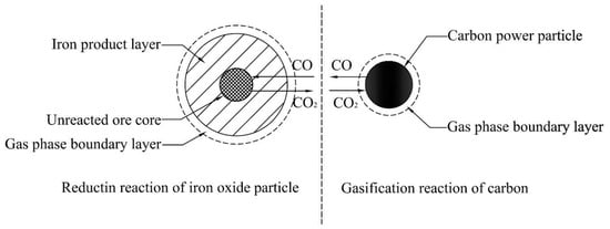 As stated in Section 3.1, the reduced iron covered the surface of the unreacted ore and formed a large area of iron crystal. Thus the reduction reaction process of the particles in the carbon-containing pellet can be described via the shrinking unreacted core model, as shown in Figure 10. The carbothermal reduction process includes the following: