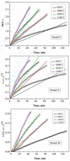 As shown in Figure 11, the data of −ln(1 − f), 1 − (1 − f)1/3and 1− 2/3f − (1 − f)2/3 at different times in the roasting process was calculated according to Equations (10)–(12) in Table 4 and then linearly fitted, and the rate constant k, equal to the slope of the fitted line, was obtained. The rate constant k and the correlation coefficient R2 of the linear fitting are listed in Table 5. As can be seen, Model I and Model III have good linear relations with time t, whose correlation coefficients are higher than those of Model II. Hence, it can be predicted that the reaction kinetics may be governed by the gasification reaction of carbon or by the diffusion of CO/CO2 in the product layer.