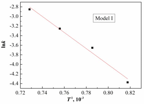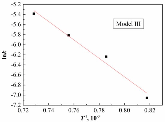 In theory, there is a linear relation between lnk and T−1. Therefore E and A can be obtained from the slope and intercept of the line fitted with lnk and T−1, as shown in Figure 12. The activation energy E is found, for Model I and Model III, to be 139.26 kJ·mol−1 and 152.40 kJ·mol−1, while the frequency factor A is 12,027.01 and 3064.19 for Model I and Model III respectively. Walker et al. [16] recommended 360 kJ·mol−1 as the true activation energy for the reaction of carbon with dioxide, and the approximate values of the activation energy were obtained by Rao [14] (301 kJ·mol−1) and Fruhen [17] (293–335 kJ·mol−1). It has also been said that the apparent activation energy is about half of the true value when the reaction is controlled by both pore diffusion and chemical reaction [16]. Consequently, the reaction kinetics of the carbon-containing pellets in our work are co-controlled by the carbon gasification reaction and the diffusion of CO in the product layer, according to the activation energy at 139.26–152.40 kJ·mol−1.