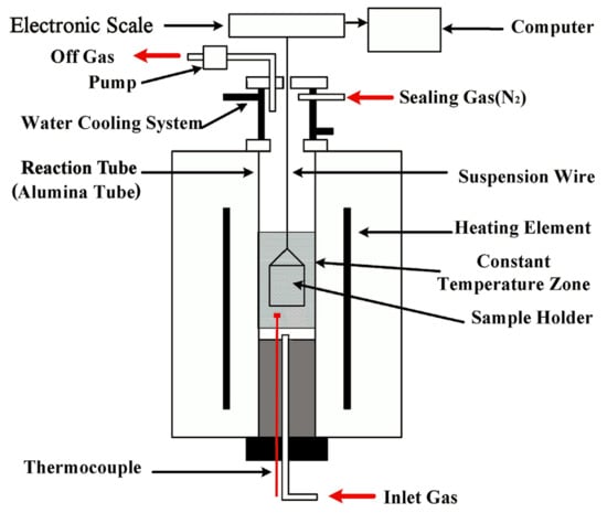 The experimental device, schematically presented in Figure 1, includes a gas supply system, an electronic scale with an accuracy of ±0.001 g, and a temperature-controlled furnace with an accuracy of ±2 K. The furnace was heated by MoSi2 elements, producing a 50 mm hot zone in the reaction tube, with an inner diameter of 60 mm. The sample holder was made of a heat-resistant alloy wire (Fe–Cr–Al).