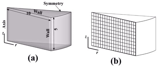 A mathematical model was established for the reduction process on a single cylindrical briquette. According to the symmetry of the geometry and the experimental conditions, a simplified geometrical model is shown in Figure 2a. The computational domain was chosen as 0.5 radian, and three types of boundary conditions, including wall, symmetry, and axis, were used in the simulations. Figure 2b schematically shows the structure’s grid system, which used a grid of 40 × 20.