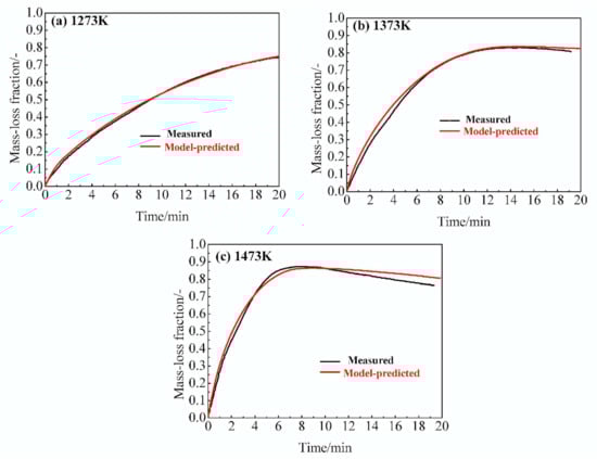 Model-predicted and experimental mass-loss fraction curves under different temperatures: (a) 1273 K; (b) 1373 K; and, (c) 1473 K.