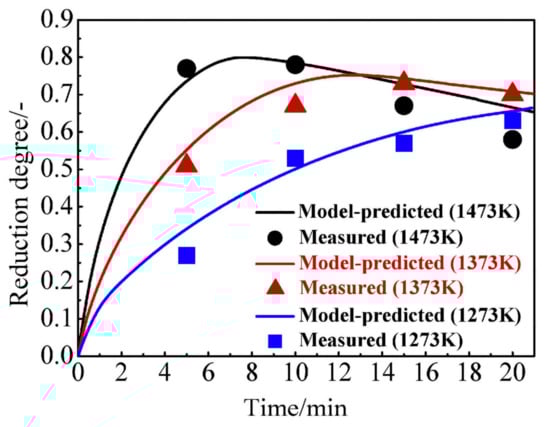 The model predictions closely match the experimental measurements at 1273 K and 1373 K, as can be seen in Figure 3a,b; however, under 1473 K, some deviation occurs in the later reduction stage (Figure 3c). In view of the assumptions that are made in the model and errors in the measurements, the agreement between them is considered to be satisfying.