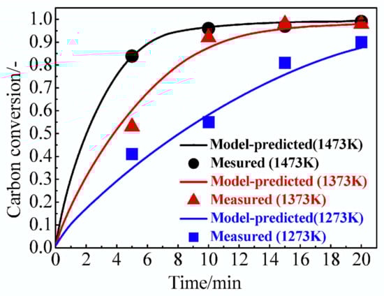 The model-predicted briquette carbon conversion is compared to the corresponding experimental measurements in Figure 5. The briquette carbon conversion increased with time at all three temperatures. Model-predicted curves at 1373 K and 1473 K show that, after reaching their maximum reduction degree (at 12 min under 1373 K and at 7 min under 1473 K), the carbon conversion increased much more slowly. By 20 min, the final carbon conversion was lower at 1273 K than at 1373 K and 1473 K. Combing the results from Figure 4 and Figure 5 indicates that more biochar could be consumed by the atmosphere with the increase of the temperature.
