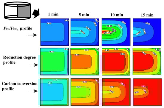 The simulation results of the development of local PCO/PCO2, the local reduction degree profile, and the local carbon conversion profile on the briquette cross section are displayed in Figure 6. In Figure 6, the local reduction degree and carbon conversion at time t were calculated by and , respectively. These simulation results were then used to assume the reduction progress of the briquette. At the beginning stage, the dominant reactions were assumed as the reactions that are given by Equations (1), (2) and (4). Owing to the intense gas generation, the briquette reduction progress was assumed to not be influenced by the atmosphere or gas diffusion. At 1 min, PCO/PCO2 was nearly uniformly profiled at a level of approximately 4.0; both the reduction degree and the carbon conversion profiles were uniform and at a degree of approximately 0.3. As time proceeded, the reactions that were given by Equations (3) and (4) became dominant. As the rate of generated product gas was reduced, the effect of gas diffusion increased. At 5 min, the atmosphere began to influence the briquette reduction progress, and the PCO/PCO2 profile in the briquette became uneven: at the core, it increased to 10.28, whereas at the surface, it only increased to 3.26. Correspondingly, the reduction degree increased to 0.88 at the core and to 0.60 at the surface, and carbon conversion increased to 0.76 at the core and to 0.90 at the surface. By 10 min, PCO/PCO2 remained higher than 2.95 in the internal part of the briquette (K5 = 2.95 under 1473 K), and reached 110 at the core, so that the reaction given by Equation (3) could still proceed there. However, PCO/PCO2 decreased to less than 2.95 at the surface of the briquette, and consequently, the reaction that was given by Equation (5) took place and became a dominant reaction. At 10 min, reduction degree increased in the internal area and reached 0.98 at the core; at the surface, it decreased to 0.50. By the end of the reduction, the dominant reactions changed to those given by Equations (4) and (5). The contour line of PCO/PCO2 = 2.95 became closer to the core, and PCO/PCO2 at the core decreased to 20.0, which reflected that the atmosphere was extending its influence toward the core. At 15 min, the reaction that was given by Equation (3) ceased. In the region with PCO/PCO2 > 2.95, the reduction degree remained higher than 0.90. However, the reaction given by Equation (5) became significant as the region with PCO/PCO2 < 2.95 was enlarged. The reduction degree at the surface further decreased to 0.40, and the weak gasification of the remaining carbon particles was then attributed to CO2 from the atmosphere.