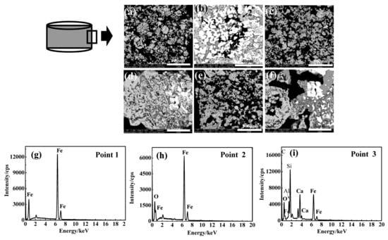 Intermittent scanning electron microscopy–energy dispersive spectrometry (SEM–EDS) results at the briquette surface: (a,b) 5 min; (c,d) 10 min; (e,f) 15 min; and (g–i) EDS results of Points 1, 2 and 3 in Figure 7b, respectively.