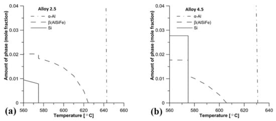 Generally, the microstructure of rheocast low silicon content aluminum alloys exhibit the presence of α-Al phase together with Al–Si eutectic mixture and some intermetallic particles [45]. Based on the presence of Fe in the two alloys (Table 1), and since its solubility in Al is very low [46], the presence of Fe-rich intermetallic particles is expected. The sequence of phase formation (aluminum phase and eutectic reaction) was calculated using ThermoCalcTM (2015b, Solna, Sweden, 2015) software [47,48]. The results are shown in Figure 2. As it is predicted by the thermodynamic model, the needle shape β-AlFeSi intermetallic particle was the most favored intermetallic phase for precipitation, and it is formed before the eutectic silicon.