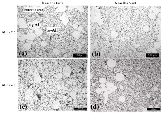 Regarding the effect of the position, the microstructure near the gate (Figure 3a,c) consists of a higher amount of α1-Al particles compared to the region near to the vent (Figure 3b,d). However, this difference is not significant in alloy 2.5.