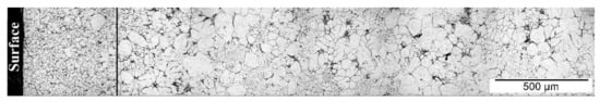 LOM image of cross-section of the thick plate of Alloy 2.5 in the region near the gate is reported in Figure 5. On the surface, there is a segregation of the liquid fraction to the surface and α1-Al solid fraction, which tend to aggregate in the center of samples. This phenomenon is considered as transverse macrosegregation. Three different phenomena lead to transverse macrosegregation: skin effect [12], sponge effect [13,50] and shearing band during melt flow that lead to porosity or eutectic-rich segregation band [52]. Study of transverse macrosegregation in different positions of the same Rheo-HPDC component performed by Payandeh et al. [53] showed that the thickness of the surface segregation layer increases by increasing the liquid faction. Govender et al. [54] also reported the existence of a surface layer consisting of mainly liquid or eutectic phase in SSM-HPDC A356 Alloy.