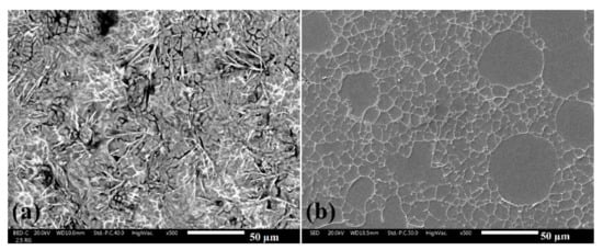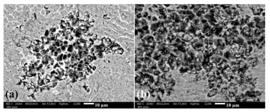 SEM micrographs and map analysis of some selected corroded surfaces are shown in Figure 19. As clearly visible in Figure 19, corrosion is mainly localized in all the samples, and takes place especially in the eutectic region, at the interface between the silicon and aluminum and at the interface of aluminum grains and iron-rich intermetallic particles. These results are in accordance with results of other researchers about corrosion of Al–Si alloys in similar solutions [34,35].